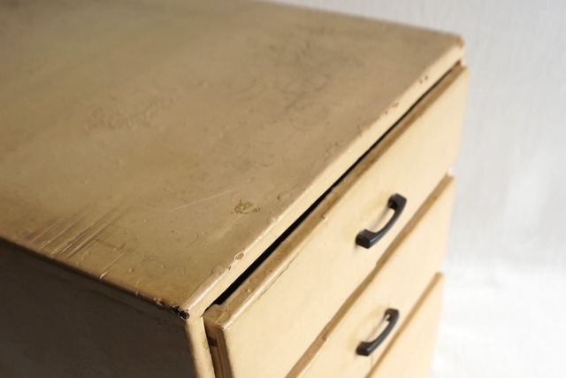 少しつや感とぼてっとした クリーム色のペンキで塗られた引き出し。 全体的にうっすら色むらがあるところがきれいです。 引き出しの中は木目が見えます。 3段目は割と深さがありますので少し高さのあるのものも入ります。 Size : 約 W24 × D34 × H27.5 cm 引き出しの内寸(約) 1段目 H4.5、2段目 H5.5、3段目 H7.5 cm 【ご購入前にご確認ください】 ・USED品のため経年によるキズや跡、昔ながらの香り、使用感等ございます。 ・お使いのモニター環境により実物と色味が異なる場合がございます。 ・お届け時の梱包にはリサイクル材も使用しております。